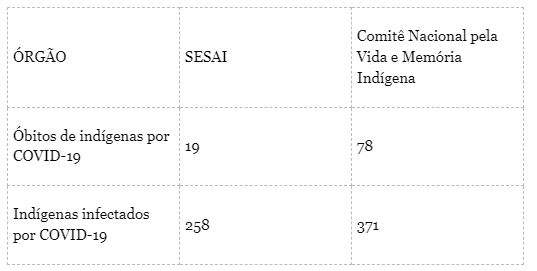 Conforme o Comitê, comparando os dados oficiais levantados junto às organizações indígenas e os dados registrados pela SESAI, até 12 de maio de 2020, percebeu-se a seguinte discrepância: