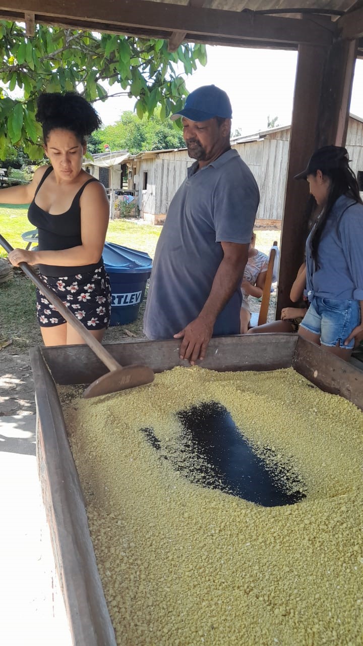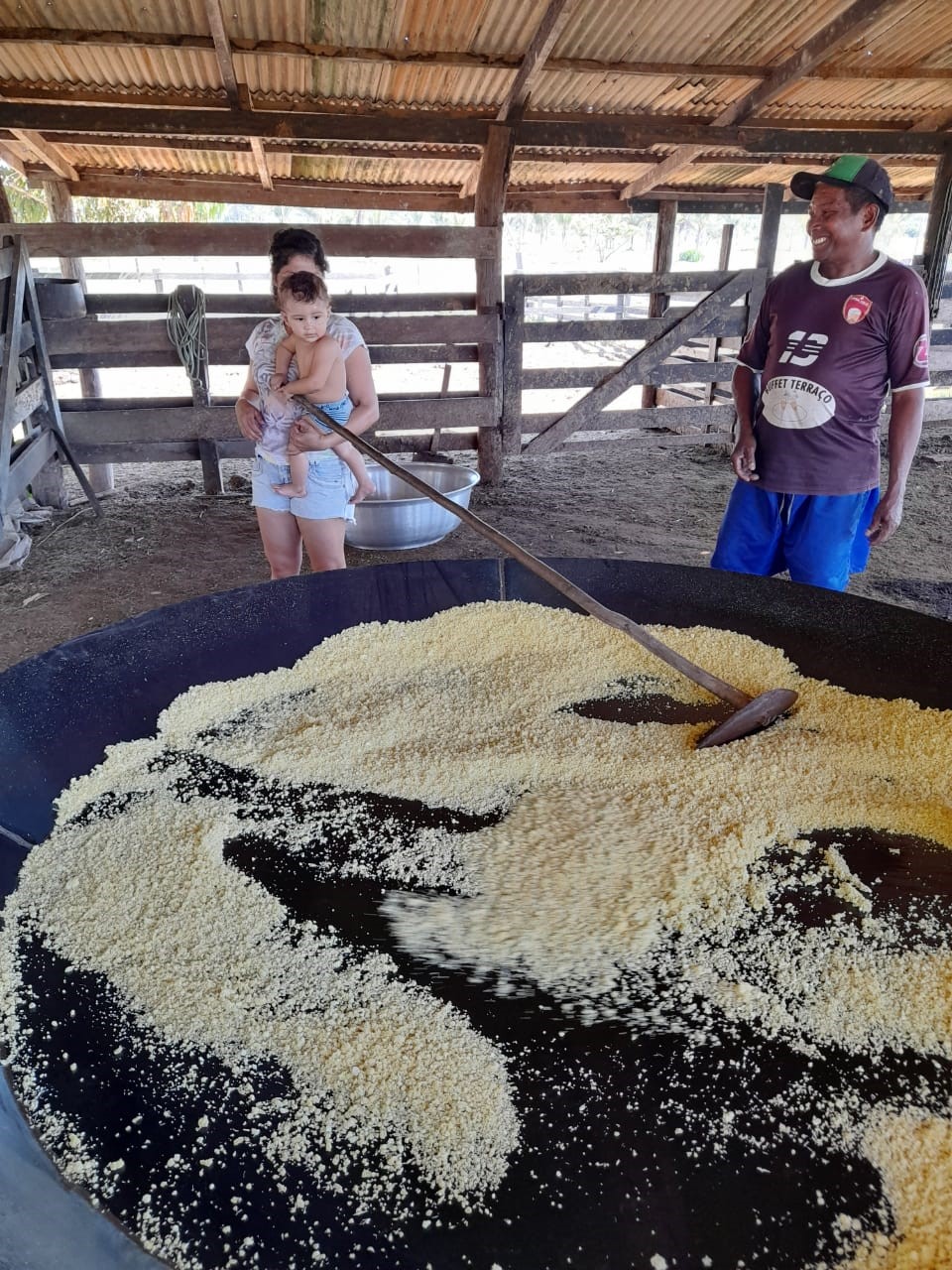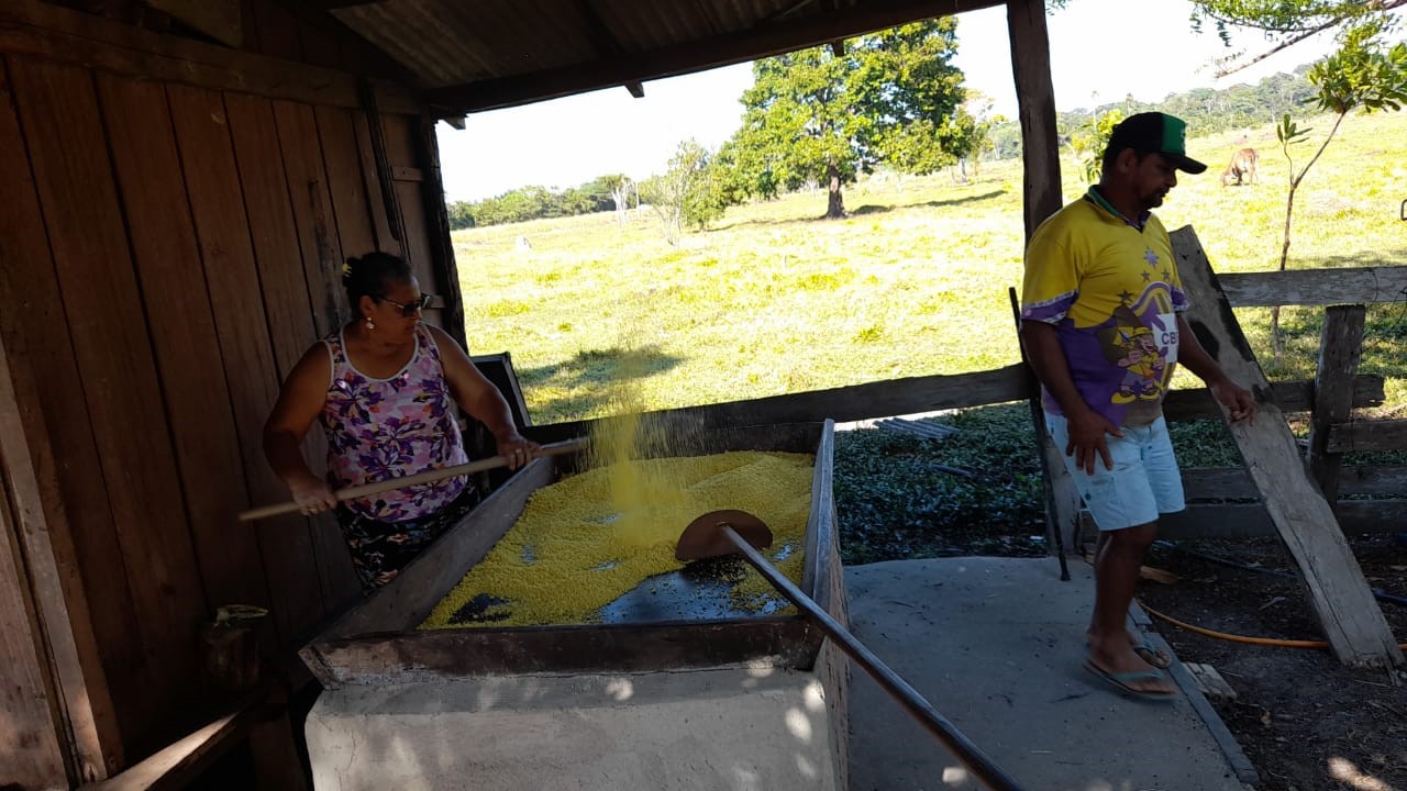Já na aldeia Aperoi, todas as famílias comem bastante farinha, feita com a macaxeira, e outros alimentos plantados nas roças, nas hortas e em seus terreiros, disse Camila, que trabalha na escola da aldeia, onde mora. Sua mãe, Hozana, explicou que antes da pandemia compravam a farinha dos indígenas Migueleno, que moram próximo aos Puruborá e também lutam pela demarcação de seu território, além da comunidade Quilombola de Santo Antônio, com quem mantêm relações de amizade e parentesco. Com a COVID-19, por medo de ir a outras comunidades e, assim, levar ou pegar a doença, deixaram de comprar. Por isso, chegaram à conclusão de que deveriam fazer sua própria farinha. O apoio para a construção da casa de farinha foi solicitado ao Conselho Indigenista Missionário (CIMI), que comprou o material e o forno para torrar farinha feita com a macaxeira da roça comunitária, tendo o apoio da Comissão Pastoral da Terra (CPT).